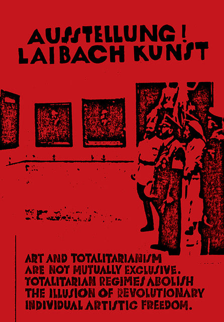 Ausstellung! Laibach Kunst was a characteristic call to Laibach's early exhibitions. These were impromptu events that lasted for one evening as a kind of soirée, attracted large audiences and provoked heated reactions. The exhibition AUSSTELLUNG! LAIBACH KUNST 1982-1984 presents this very early visual production with artworks in various techniques: paintings, prints, xeroxes, installations, photographs, video, posters and publications. An ambient installation in the same premises - the Škuc Gallery - recapitulates the original installations after more than forty years and reconstructs the aforementioned artistic production of Laibach in the formative years, between 1980 - 1984, the present poster of which is a motif in some of these early exhibitions, served as the cover of the invitation card, summarizes the central motto of Laibach's engagement with art, which asserts that "art and totalitarianism are not mutually exclusive" and that "totalitarian regimes abolish the illusion of revolutionary individual artistic freedom".