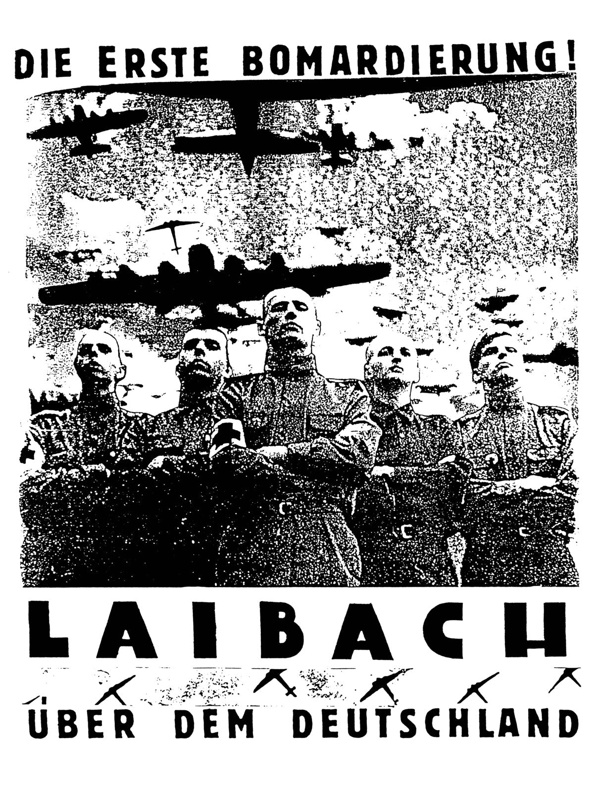 Leftists and rightists were appalled by the militant motif – uniformed members of the group are deployed in monolithic formation, and military bombers are humming above them. The title of the poster promised “The First Bombardment – Laibach over Germany,” which was, understandably, an unpopular topic for Germans after World War II. The title, however, also provoked a great deal of ridicule from attentive readers because an error had ‘crept’ into it. The word Bombardierung (bombardment) is misspelled, the letter 'b' is missing. Laibach made the mistake unintentionally, but then deliberately kept it. The planes are taken from a World War II photograph showing German bombers over London. Members of the group are actually dressed in Yugoslav military uniforms, which consequently drastically changes the intonation of the poster.