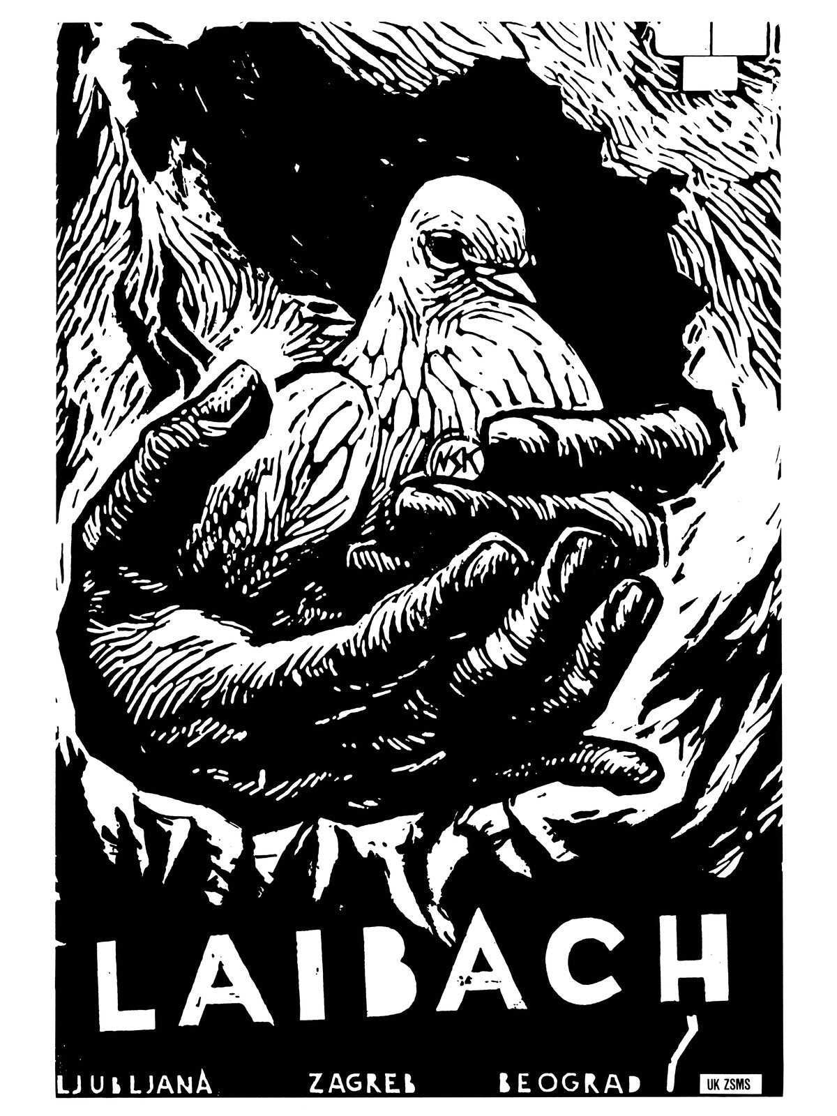 On this occasion, the present artwork was created as a poster (in collaboration with NK – New Collectivism). On it we can see Yugoslavia as the ‘black hole’ in the background (from which there is no return), and around it the effect of fire is created by the woodcutting technique, which mercilessly surrounds the country. The character of the dove of peace – which everyone was talking about while they were preparing for war – dominates in the foreground. But the pigeon is probably more 'trapped' in the hands and it looks like it is hard for it to fly in freedom. In the case of Yugoslavia, it certainly did not succeed.