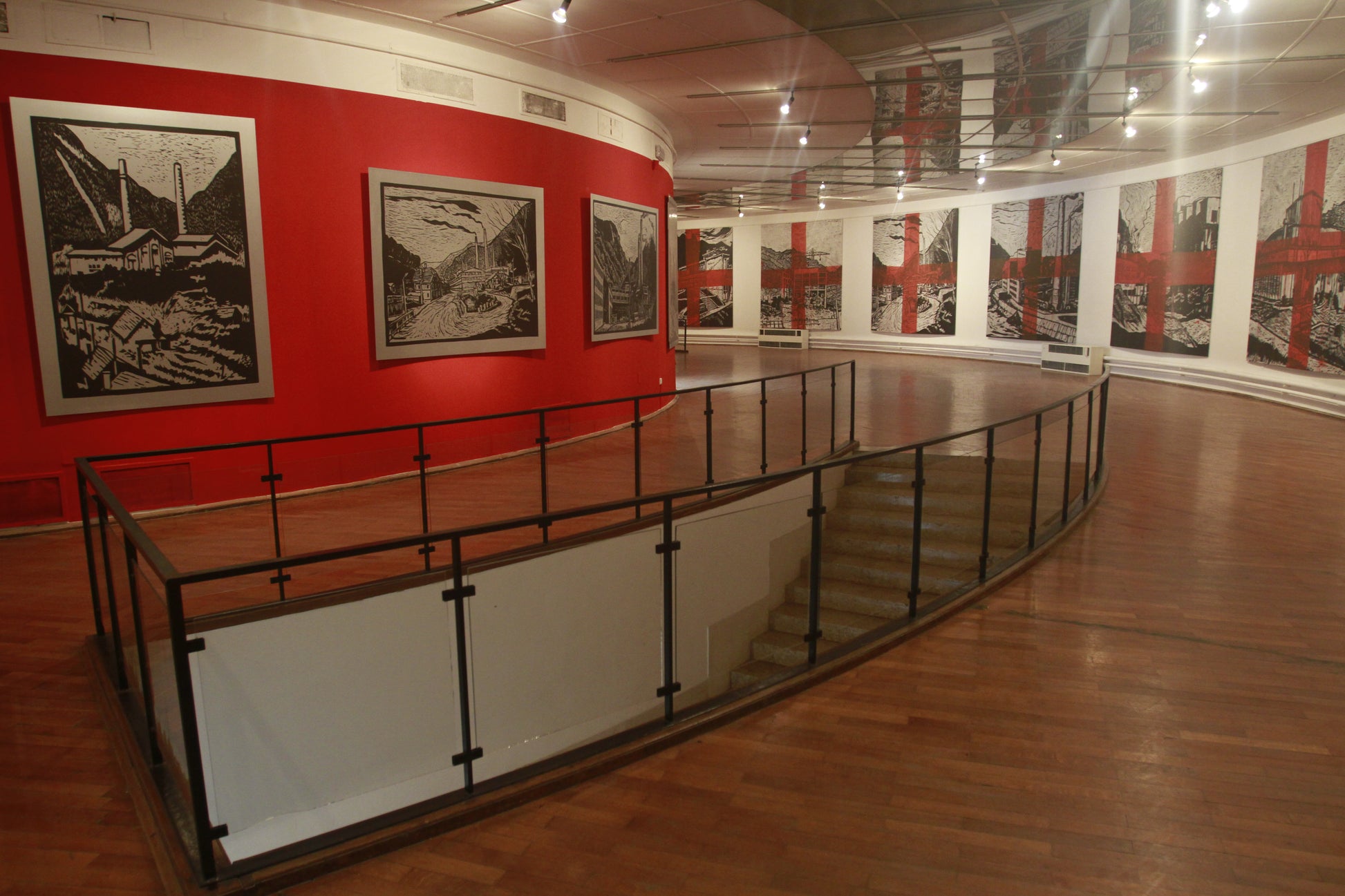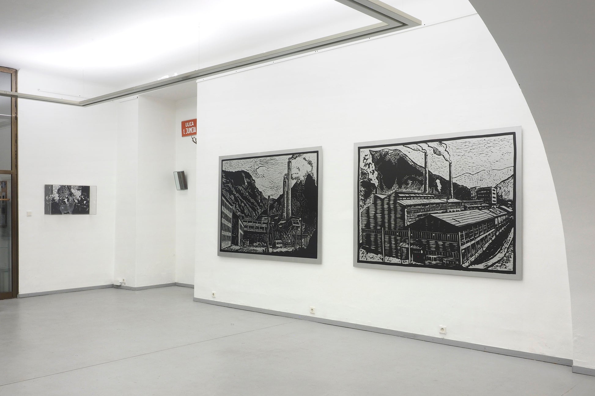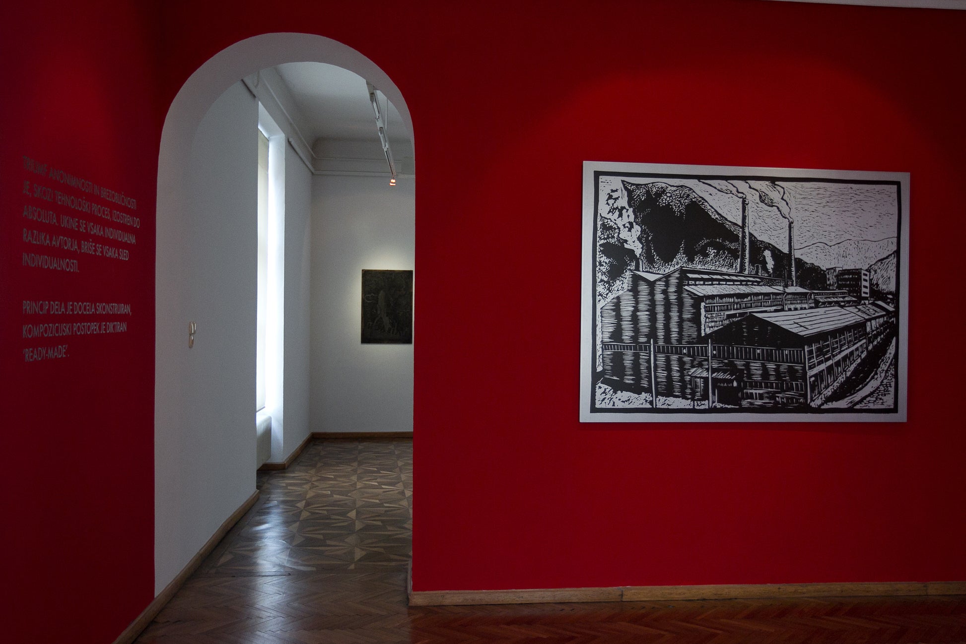 The original linocuts represent historical motifs from the so-called Red Districts, as the industrial basin of Slovenia in the Zasavje region is called, which encompasses the towns of Trbovlje, Zagorje, and Hrastnik, i.e. the environmental area where the band Laibach were formed in 1980. These ‘industrial’ motifs became part of the basic aesthetic content of Laibach, which never denied their industrial-cultural origins, and after the formal establishment of the broader umbrella art formation Neue Slowenische Kunst (1984–1992), these motifs were adopted and appropriated from Laibach by other NSK groups, most notably by the Irwin painting group.