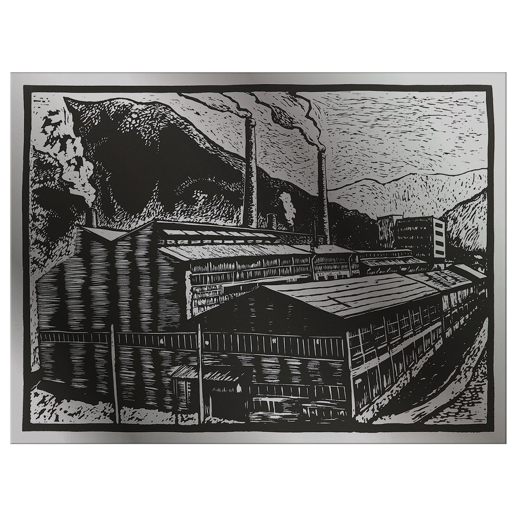 The image "Glass Factory Hrastnik", is one of the eight iconic motifs from the Red Districts series in this set (all prints on aluminium plates). The Hrastnik glassworks factory started producing glassware (beer glass, medical glass, cut glass and crystal glass) in 1860. In 1903, the factory was taken over by Franz Wieltschnigg, who modernised and expanded the business considerably and extended sales abroad, including across overseas.