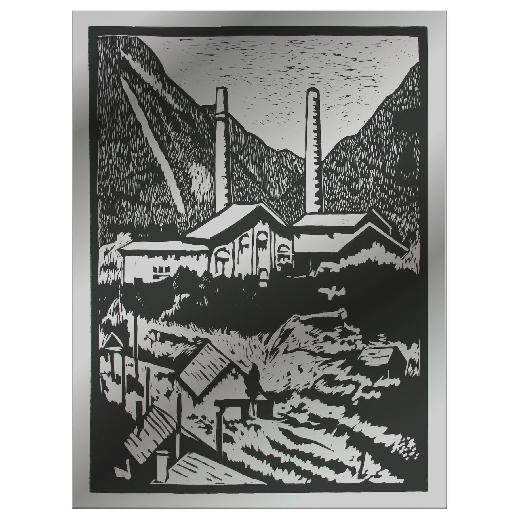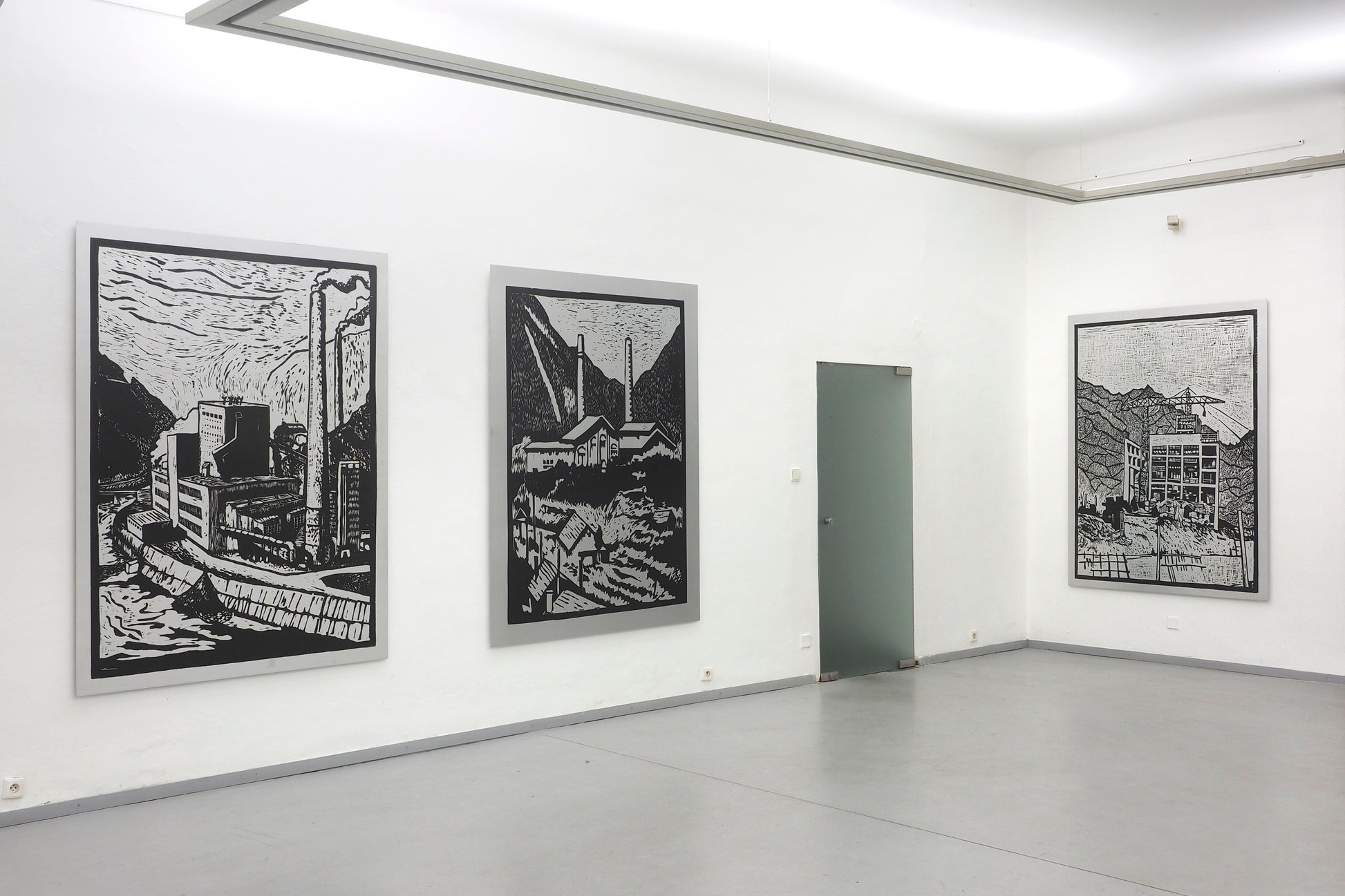 The original linocuts represent historical motifs from the so-called Red Districts, as the industrial basin of Slovenia in the Zasavje region is called, which encompasses the towns of Trbovlje, Zagorje, and Hrastnik, i.e. the environmental area where the band Laibach were formed in 1980. These ‘industrial’ motifs became part of the basic aesthetic content of Laibach, which never denied their industrial-cultural origins, and after the formal establishment of the broader umbrella art formation Neue Slowenische Kunst (1984–1992), these motifs were adopted and appropriated from Laibach by other NSK groups, most notably by the Irwin painting group.