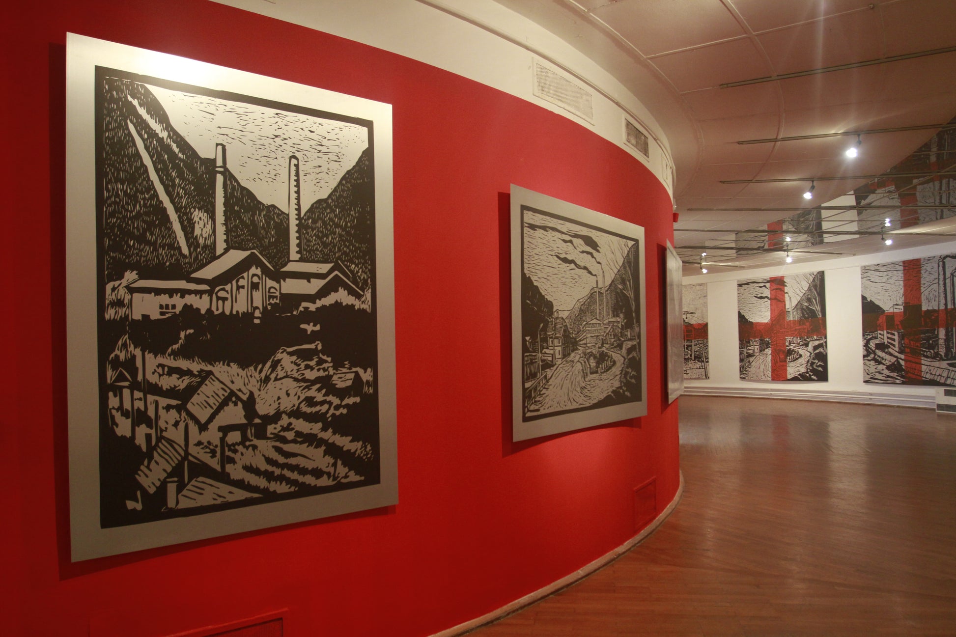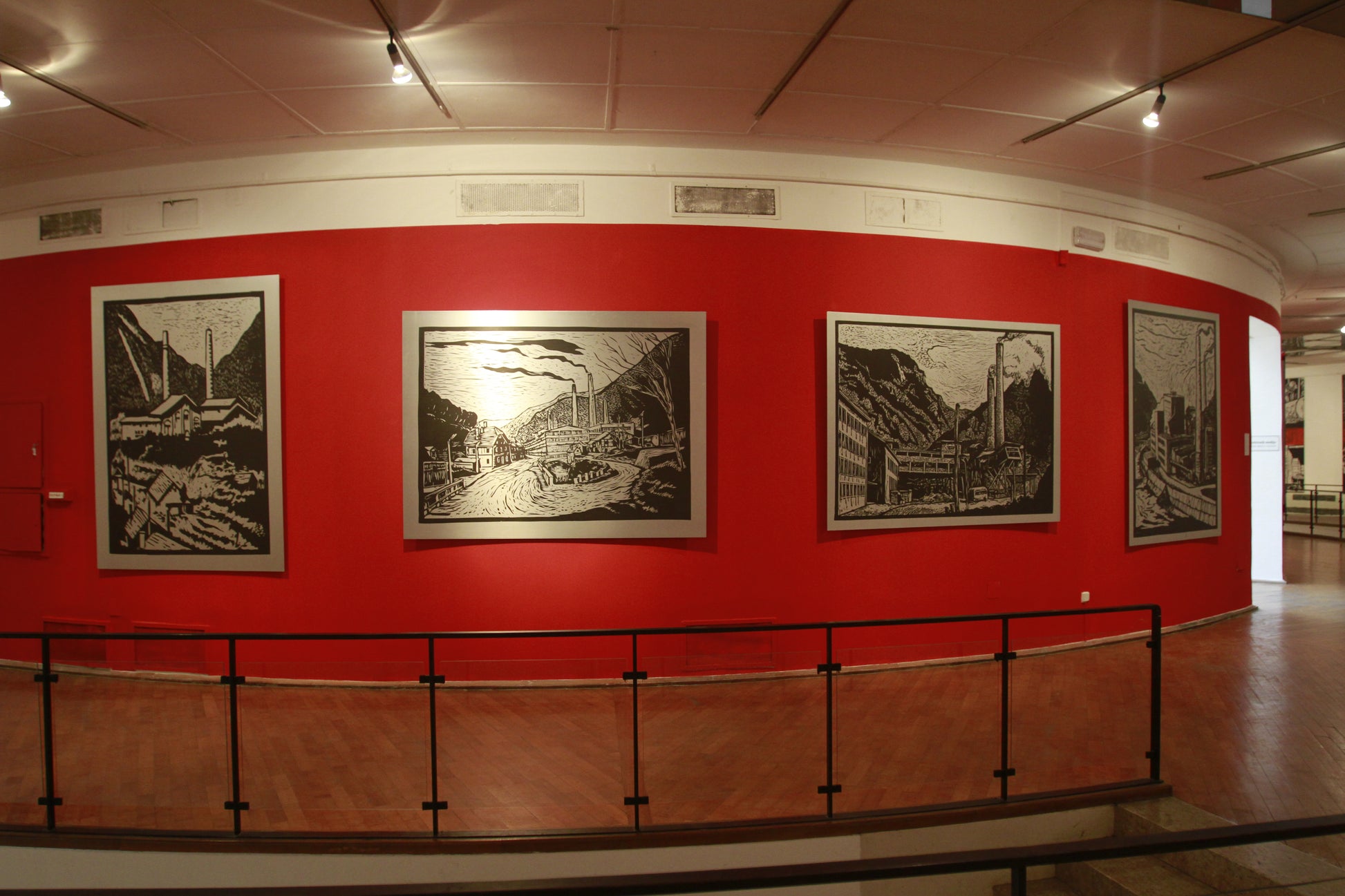 The original linocuts represent historical motifs from the so-called Red Districts, as the industrial basin of Slovenia in the Zasavje region is called, which encompasses the towns of Trbovlje, Zagorje, and Hrastnik, i.e. the environmental area where the band Laibach were formed in 1980. These ‘industrial’ motifs became part of the basic aesthetic content of Laibach, which never denied their industrial-cultural origins, and after the formal establishment of the broader umbrella art formation Neue Slowenische Kunst (1984–1992), these motifs were adopted and appropriated from Laibach by other NSK groups, most notably by the Irwin painting group.