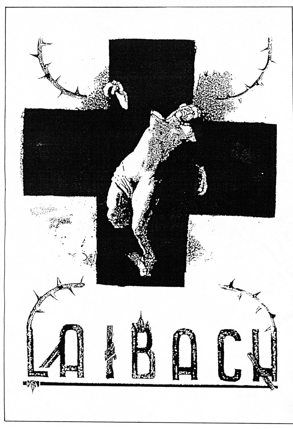 On this occasion, Laibach created a promotional poster, which besides the album name on the cover also prominently included the name of the group. The basic motif of the poster is a black cross – the recognizable symbol of Laibach – with a figure from an anti-Nazi poster made by John Heartfield in 1934 added to it in the pose of a saviour on a crucifix. The title of Heartfield’s poster is “As in the Middle Ages ... so in the Third Reich”, and it consists of two parts: the illustration above shows a medieval sculpture of Saint George tied to a large wooden wheel, while the bottom shows a similar victim of National Socialism tied to a swastika. John Heartfield used his friend Erwin Geschonneck as a model for the victim, who posed naked for the photo on an equilateral (i.e. Greek, Swiss, etc.) cross, the kind used by Laibach on their poster. The title Resurr Exit is a play on meanings, and comes from the Latin word ‘resurrexit’, which means rebirth or resurrection. The title is also a reference to Marcel Duchamp and Anselm Kiefer, both of whom had used a similar title in their works.