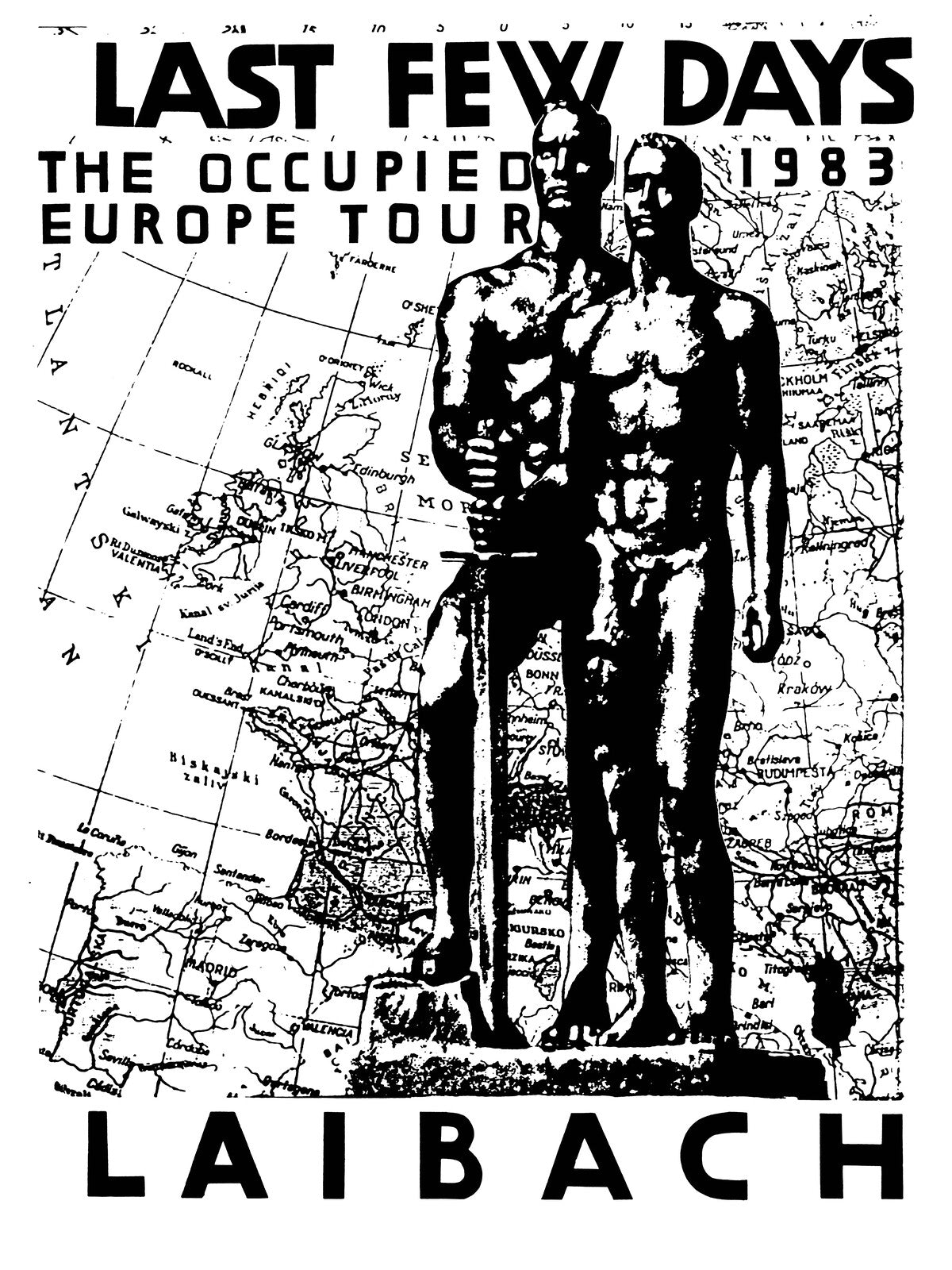 Each of the groups designed their own poster for the tour, and the idea was to always use both together. LFD produced an elegant poster with its symbol of the black sun and Laibach’s black cross, while Laibach designed a more controversial poster. They used a map of Europe dominated by two naked athletic figures holding large swords in their hands. The figures are actually a statue by the great German sculptor Georg Kolbe from 1935, which was supposed to symbolize a united Europe. His monumental, idealized, homoerotic, naked athletic figures relied on ancient plaster mould casts, and such statues can still be found all over the world today. The problem is that the Nazis appropriated Kolbe’s style of creation and declared the artist one of the major sculptors of National Socialism (despite the fact that he refused to portray Adolf Hitler and collaborated with modernists such as Lilly Reich and Mies van der Rohe, and as the president of the Deutscher Künstlerbund [German Association of Artists] he also promoted artists whose works were classified as degenerate art in the Third Reich). Due to this connection with Nazism and the Nazi aesthetic canon, the poster provoked a lot of outrage and protests, especially in the Federal Republic of Germany, where the two groups played two concerts, in West Berlin and Hamburg.