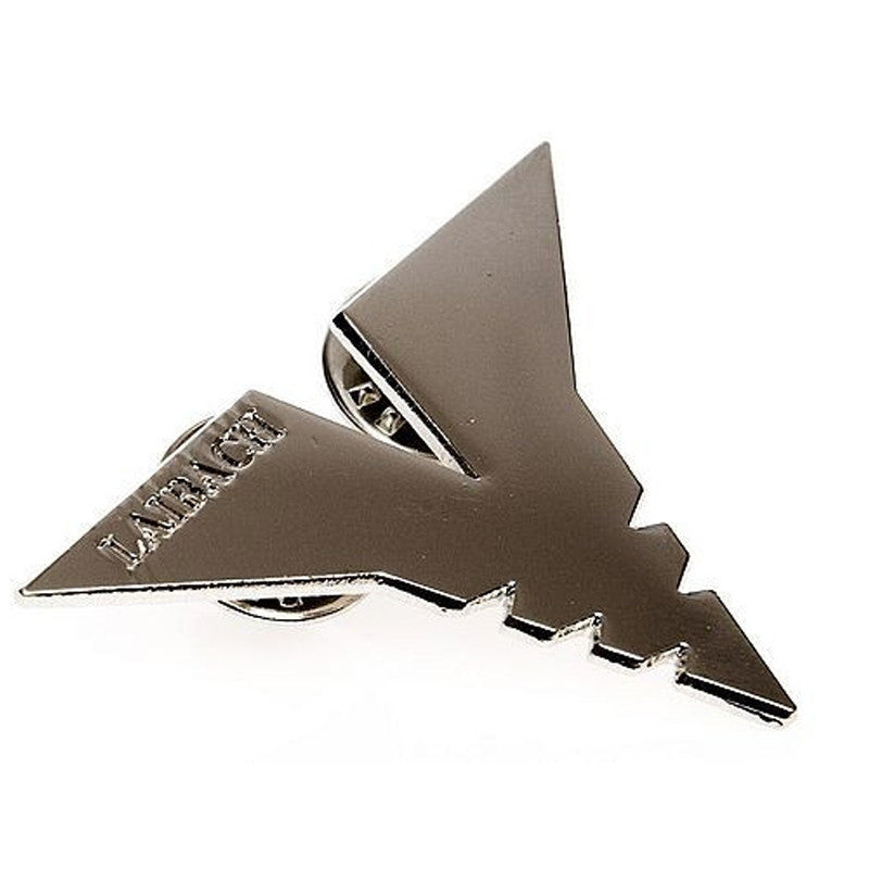 The motif of the badge is from the Volk album symbol. The name of the album is a typical Laibach pun: “Volk” means “wolf” in the Slovene language and “nation” or “people” in German. The albums slogan is “POP music is for sheep and we are wolves disguised as shepherds.” (Laibach)